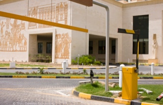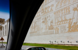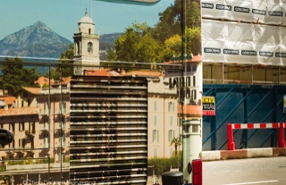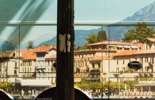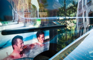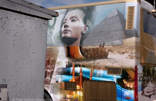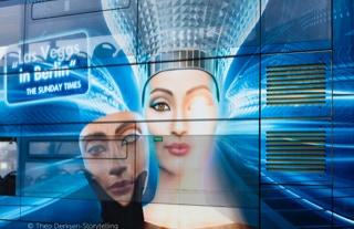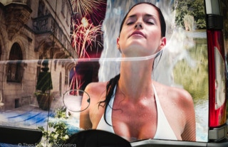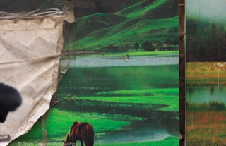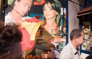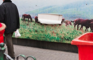 Only Derksen’s is a response to the greater intensification of the image world in urban spaces, the digital-borne ubiquity and proliferation of images that now can be reproduced on almost everything. A photograph from Cairo, for example, sets the back-end of a tourist coach, adorned with a flashy montage of pictures advertising the country’s attractions, against the foreground detail of the flaking grey-painted surface of a kiosk structure. It typifies the kind of formal collisions running through these pictures, the way in which hyped-up promotional appeal jars and collides with a situation and context that is dull and grey by comparison. The Cairo picture is however given another dimension and visual complication by the fact the image of one of the Pyramids on the coach is also grey as it is drained of color for contrast against the other colorful tourist images.