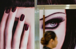 The registration of the social real presents us with people’s dormancy and passivity, a certain obliviousness to the images that now fill their worlds. The action and animation seems to all be in the image world. Derksen is fascinated in showing us the fractures and disorientating effect of the theme park world of urban spaces, even going as far as to invert a few photographs in the book to further confuse us. But the way in which he photographs people in these cities means they neither compete with nor contest that image world. In one of the most charged juxtapositions, taken in Dubai, a worker is enmeshed by the cage trolley he is pushing and dwarfed by the orientalising image of a woman’s face behind him. Setting up a fantasy of sexual enslavement, the woman in the huge ad is adorned and eroticised with decorative chains, one of which suggestively runs through her mouth. All this is played out against the implied subservience and entrapment of the worker. The image spectacle is not undone or unmasked here, instead Derksen’s photograph shows how its allure and spell dominates and binds